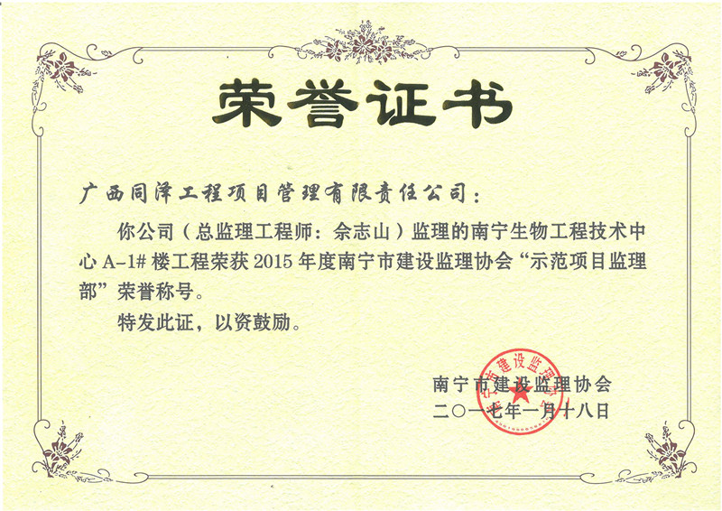 南宁生物工程技术中心A-1#楼项目荣获2015年度“示范项目监理部”荣誉称号