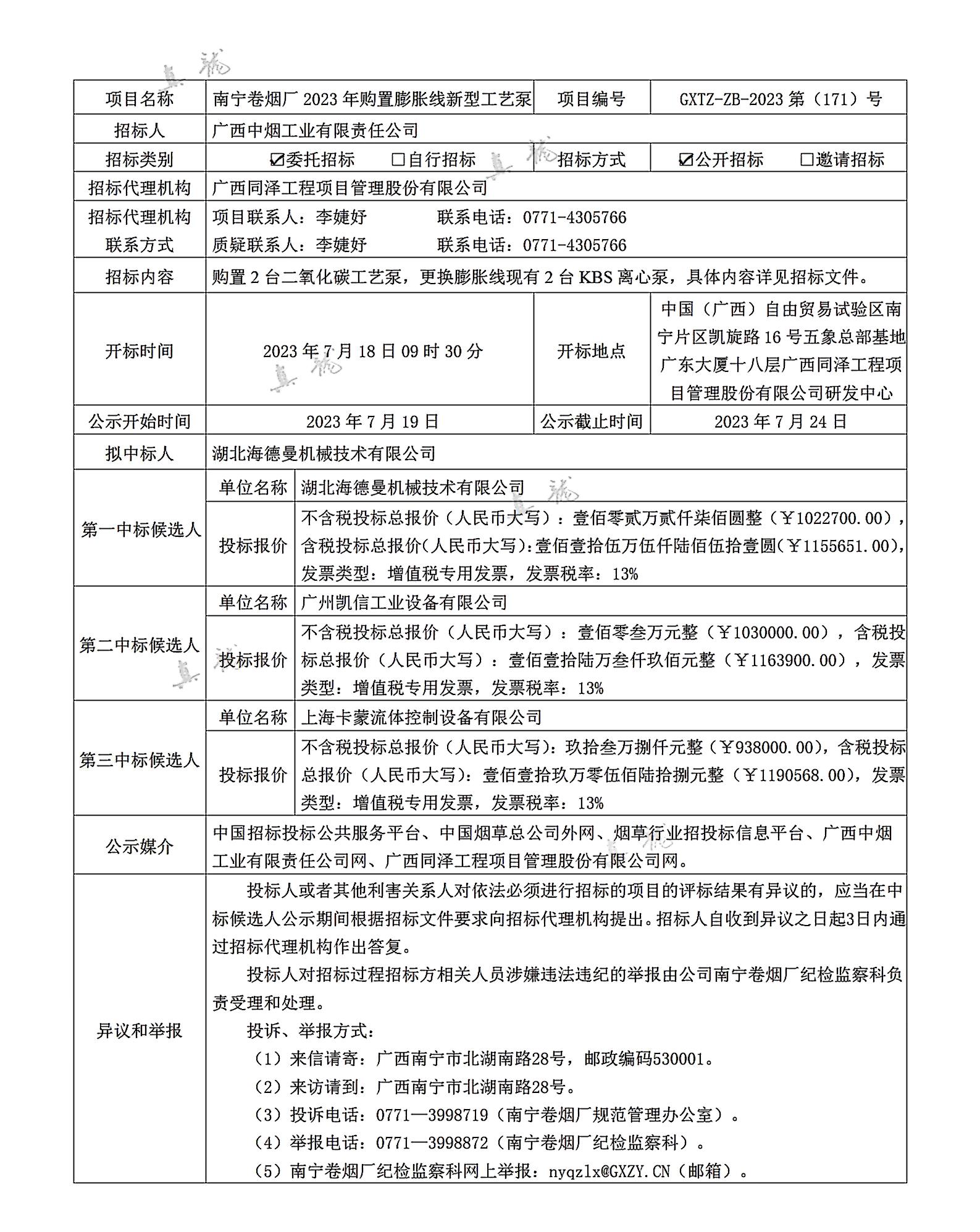 广西中烟工业有限责任公司南宁卷烟厂2023年购置膨胀线新型工艺泵(项目编号:GXTZ-ZB-2023第(171)号)中标候选人公示