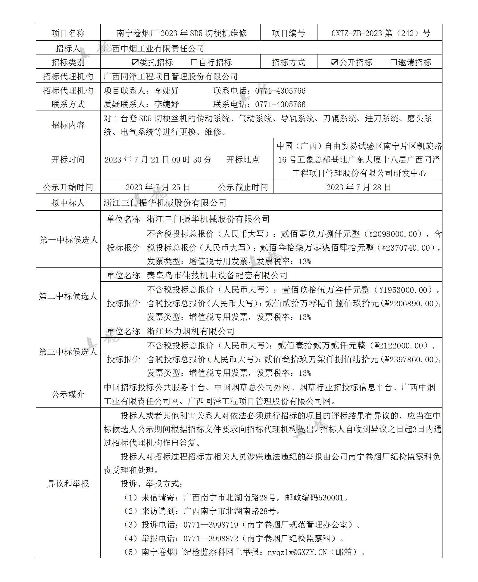 广西中烟工业有限责任公司南宁卷烟厂2023年SD5切梗机维修(项目编号:GXTZ-ZB-2023第(242)号)中标候选人公示