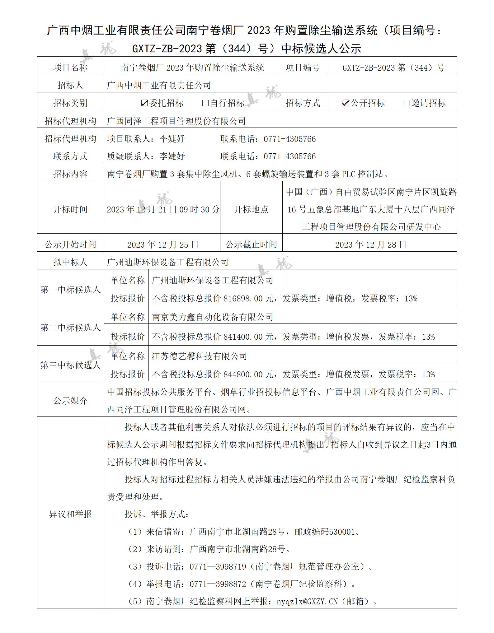 广西中烟工业有限责任公司南宁卷烟厂2023年购置除尘输送系统(项目编号:GXTZ-ZB-2023第(344)号)中标候选人公示