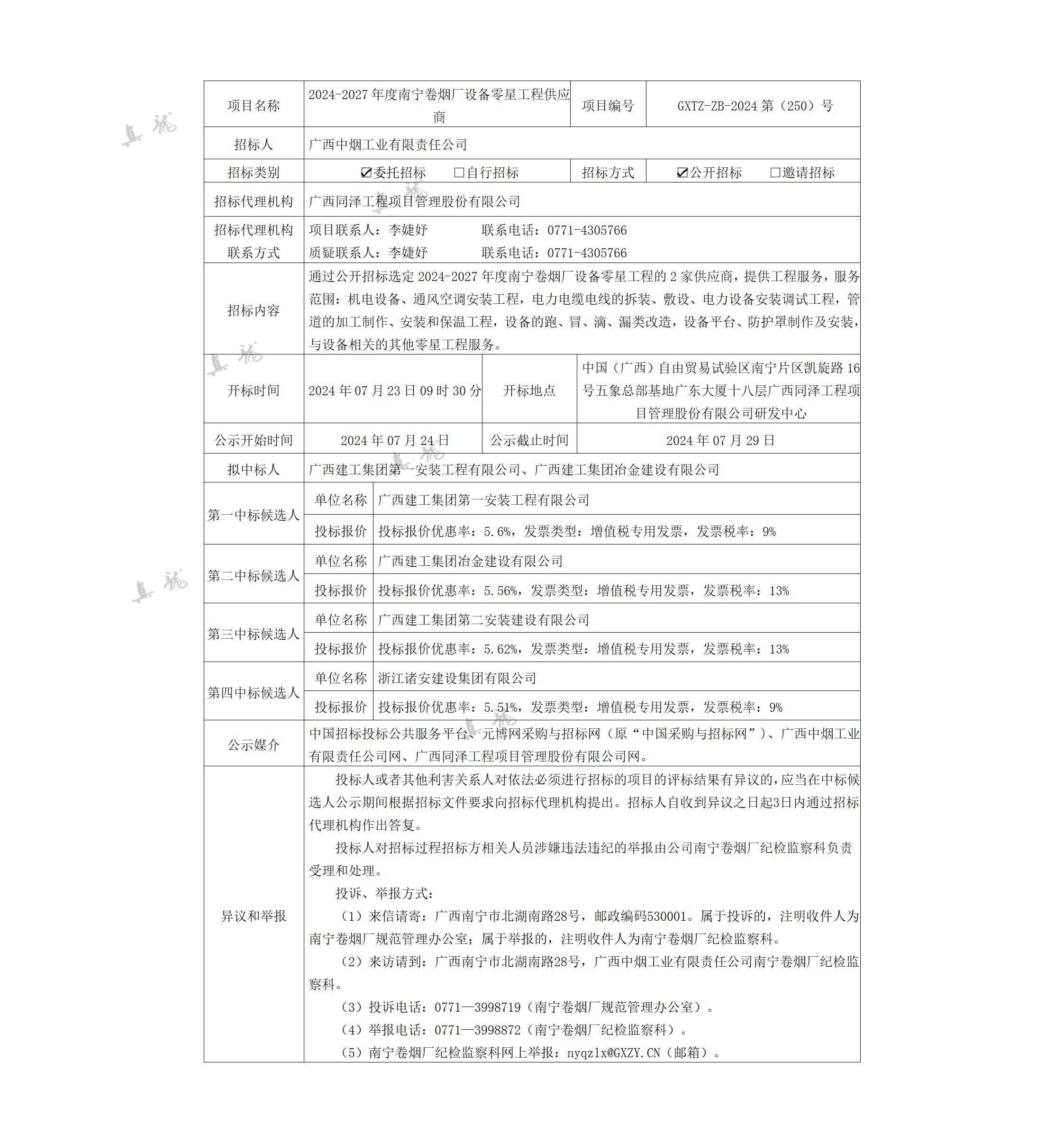 广西中烟工业有限责任公司2024-2027年度南宁卷烟厂设备零星工程供应商(项目编号:GXTZ-ZB-2024第(250)号)中标候选人公示